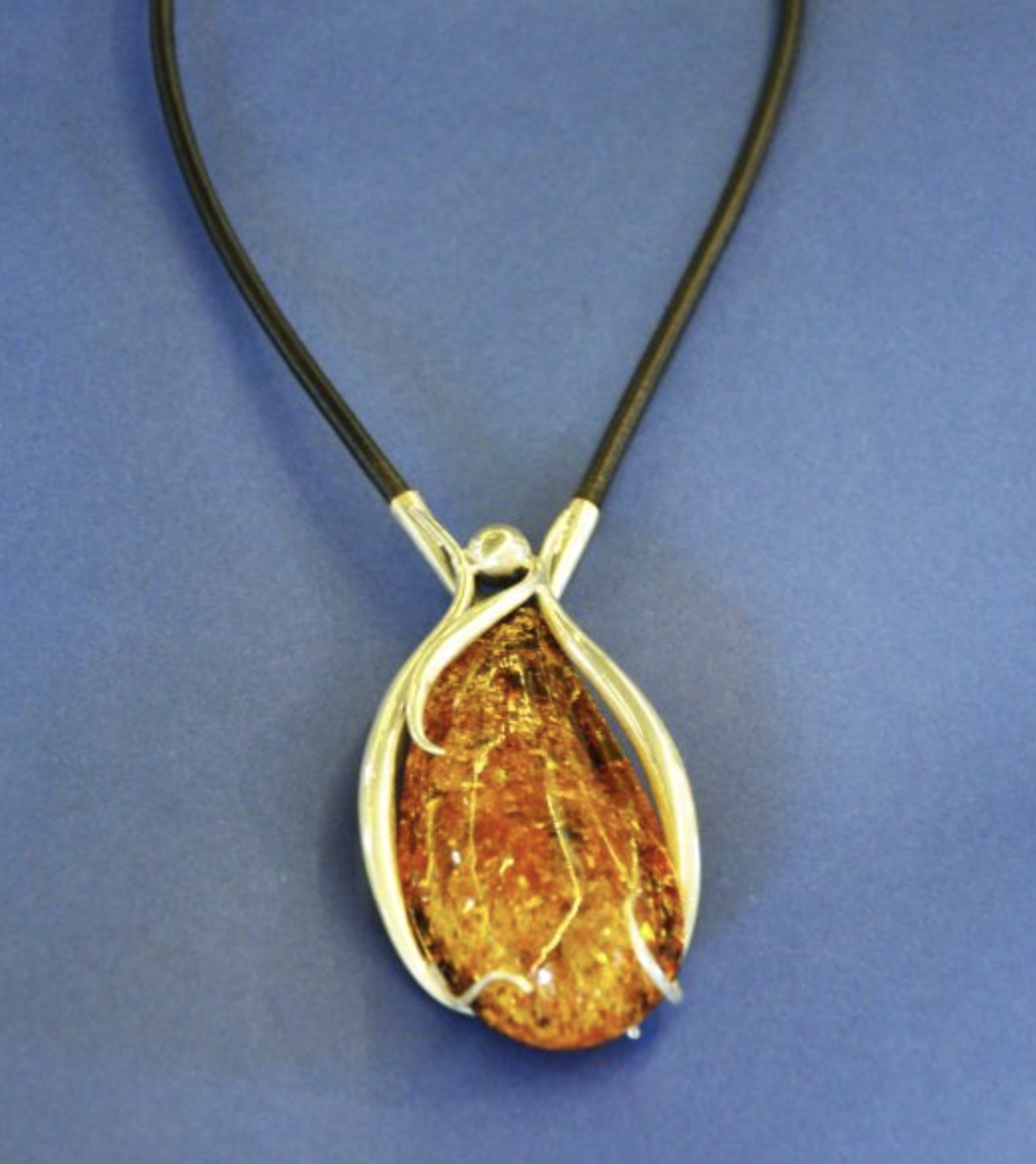 Duży, niezwykle rzucający się w oczy koniakowy bursztyn w eleganckim kształcie. Zawieszony na czarnym, skórzanym rzemyku. Długość naszyjnika regulowana.