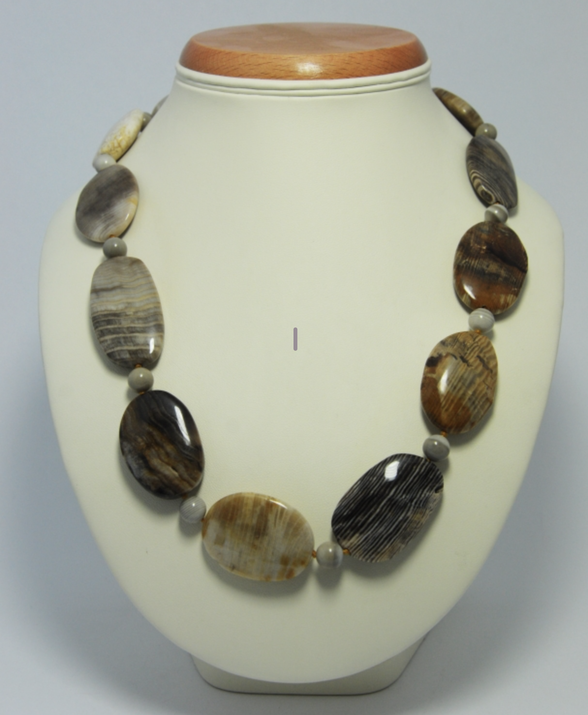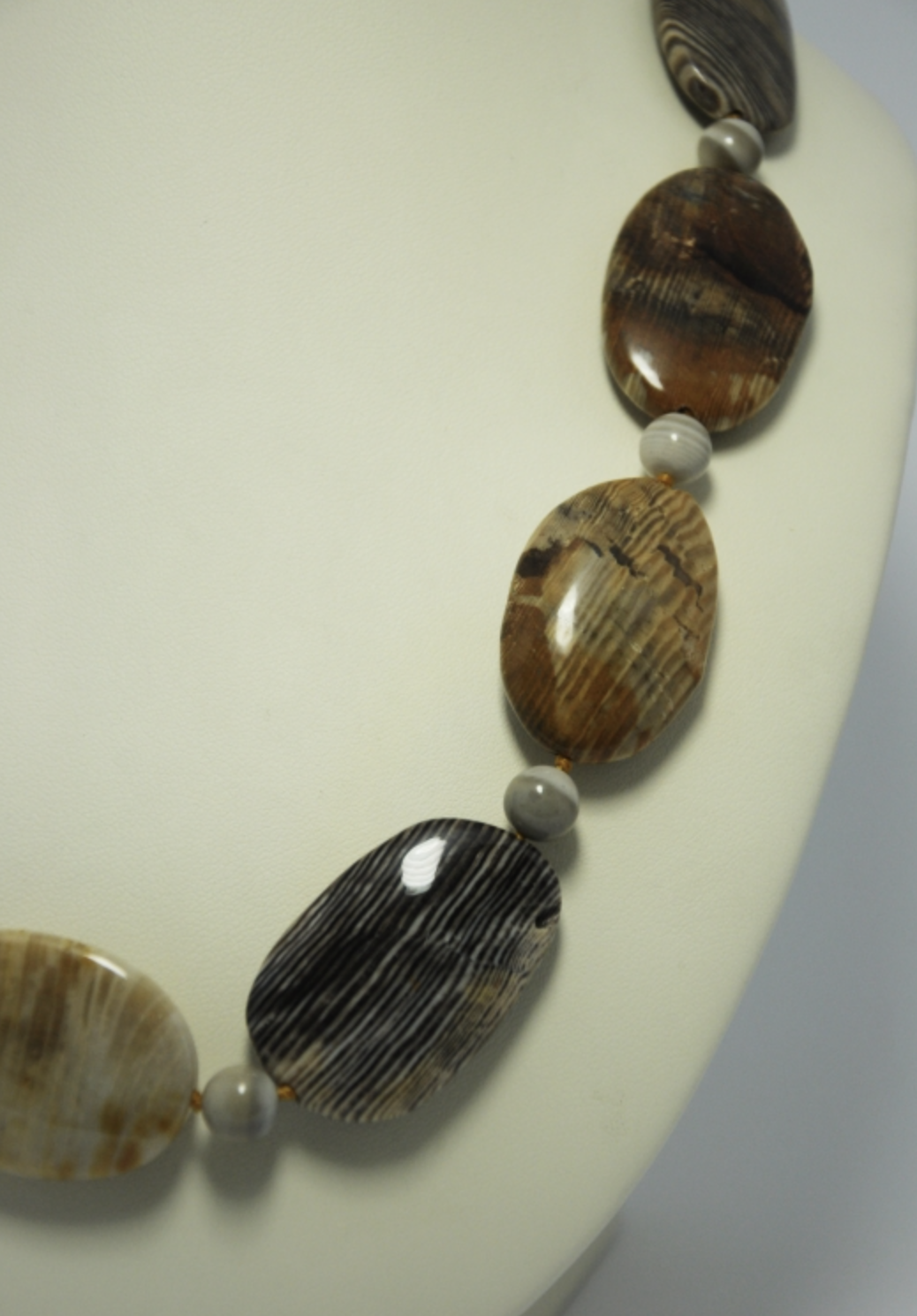 Korale wykonane z agatów w piaskowych kolorach. Płaskie, owalne kamienie przeplatane małymi kuleczkami agatu.