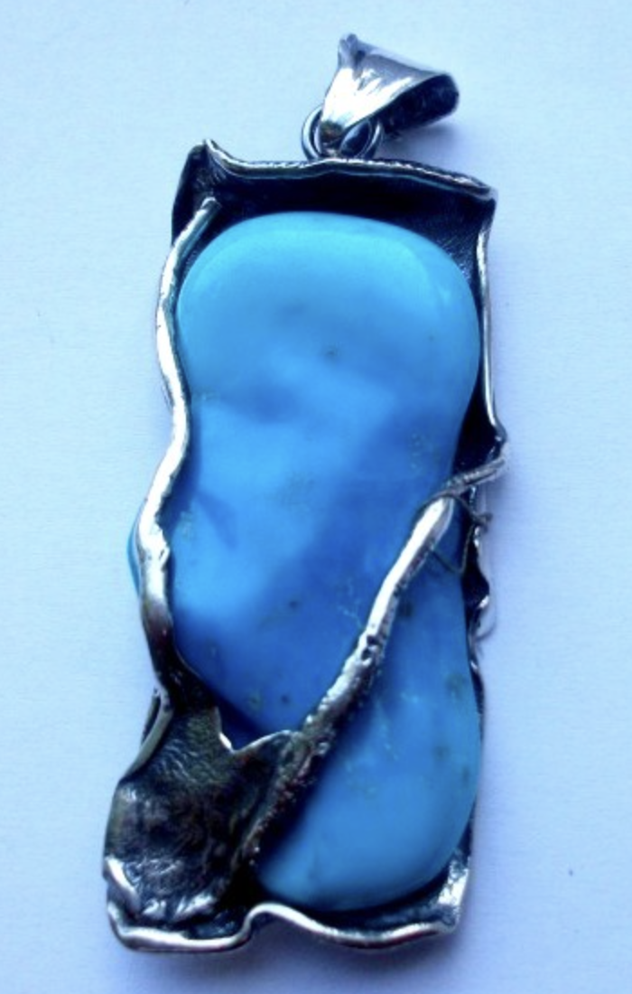 Wisior z turkusem z amazonii oprawiony w oksydowane srebro próby 925. Długość wisiorka wraz z zawieszeniem 7cm, szerokość 2,5cm. Możliwość dokupienia do kompletu bransolety, kolczyków oraz pierścionka.