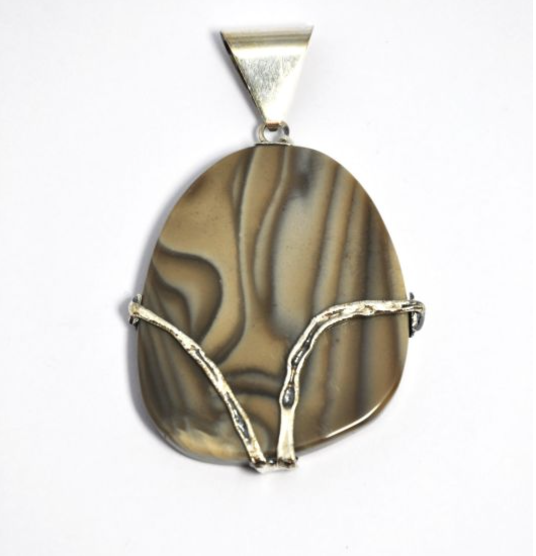 Oryginalna zawieszka wykonana z krzemienia pasiastego wykończona fantazyjnie poprowadzonym srebrem. Krzemień pasiasty- niezwykle rzadki, dekoracyjny dodatek, który doda elegancji każdej kreacji.