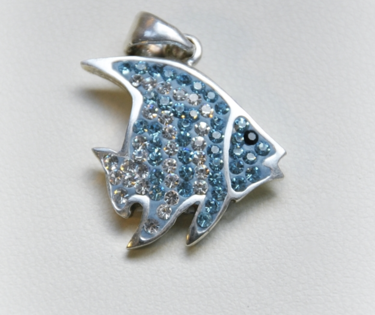 Zawieszka w kształcie rybki. Kryształ Swarovskiego w kolorze niebieskim oraz bezbarwnym. Całość wykonana ze srebra, próby 925