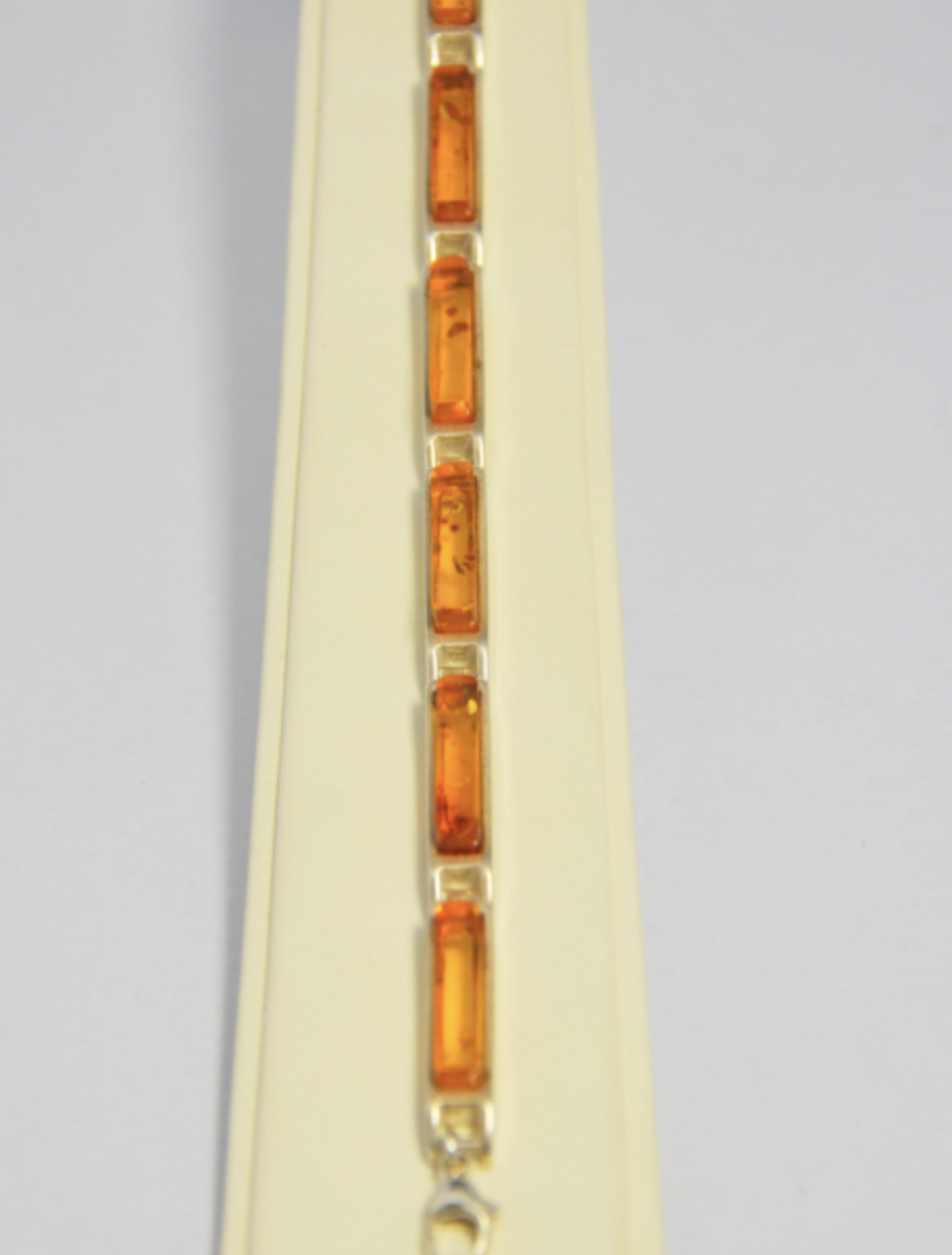 Bransoleta z podłużnymi wąskimi bursztynami, wykonana ze srebra próby 925.