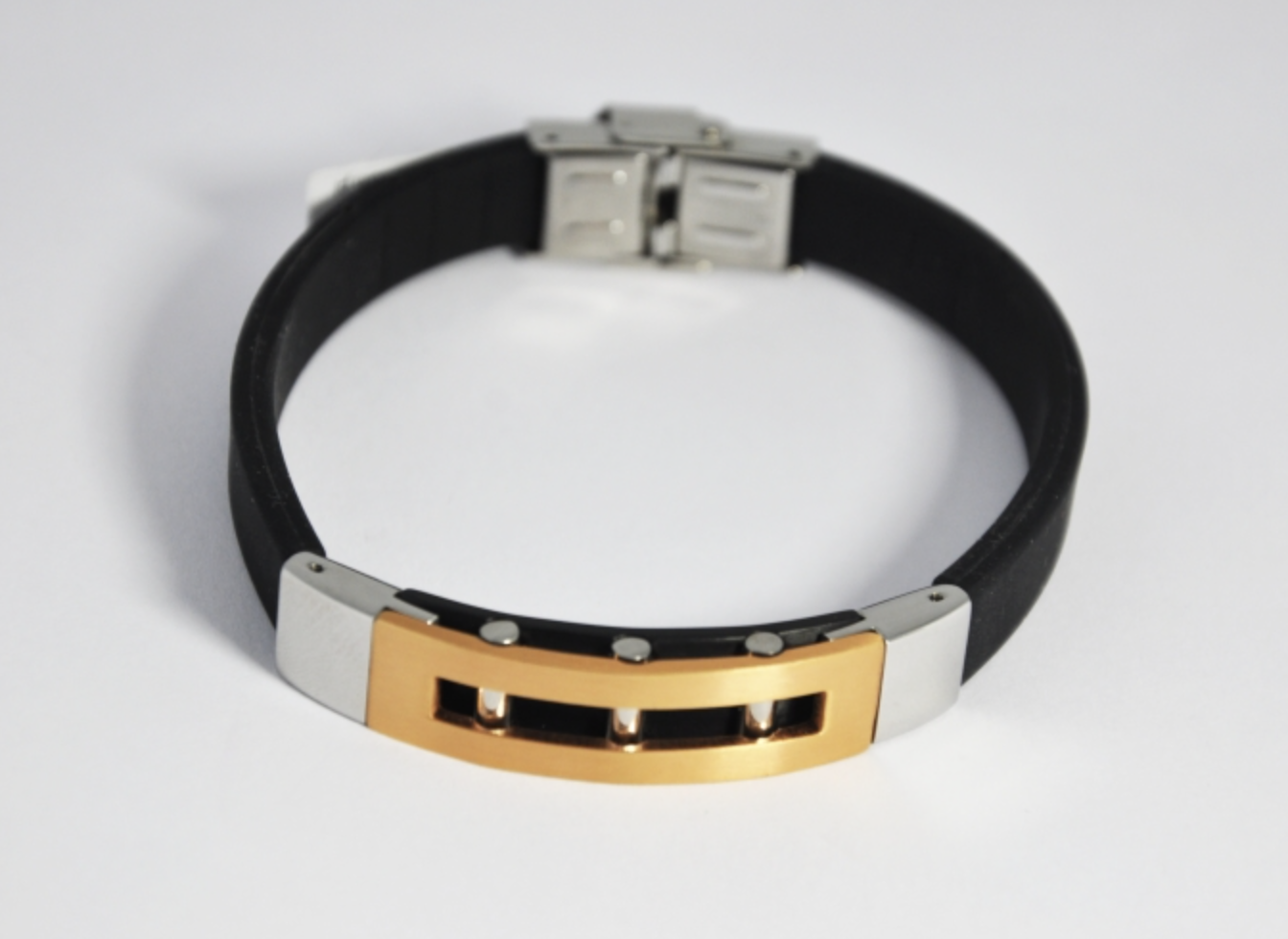 Nowoczesna męska bransoleta wykonana z wytrzymałego kauczuku. Wykończona srebrem oraz pozłacanym metalem