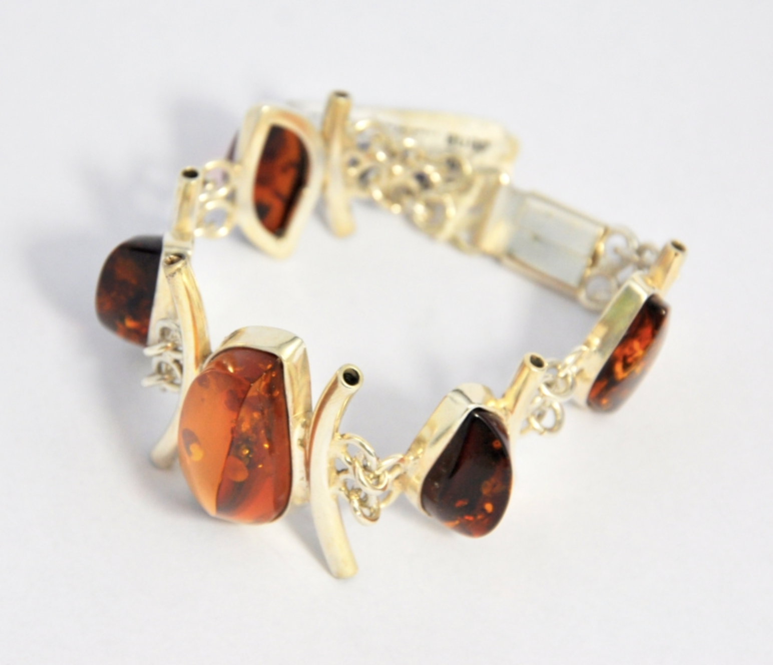 Oryginalna srebrna bransoleta z bursztynami w ciekawym kształcie. Niespotykany dodatek, który doda elegancji każdej kobiecie.