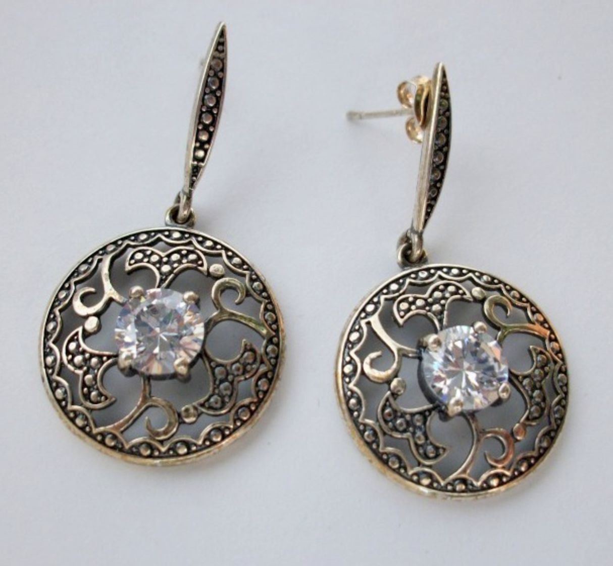 Okrągłe kolczyki na sztyfty z białym oczkiem, oraz z ciekawym motywem roślinnym.