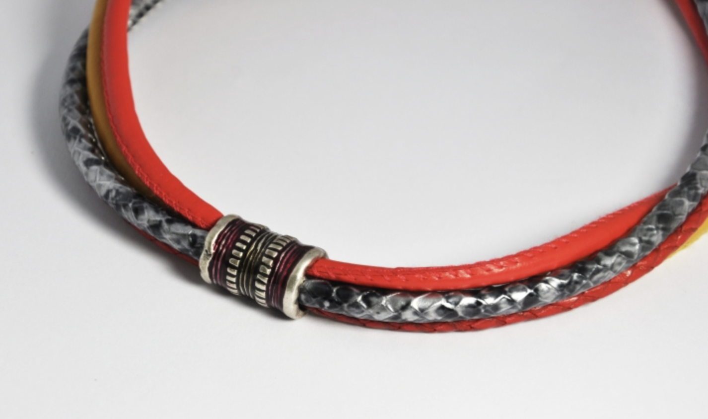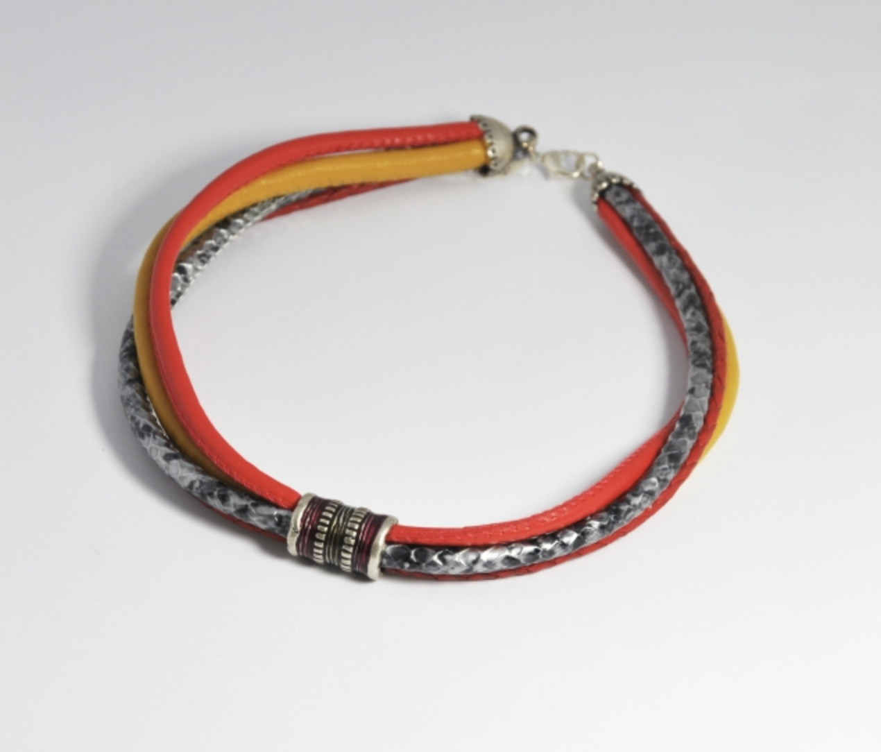 Nowoczesny naszyjnik wykonany z czterech skórzanych rzemyków w przyjemnych kolorach. Całość ozdobiona posrebrzanym pierścieniem z różowym kolorem.