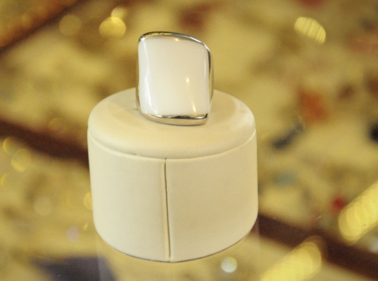 Pierścionek z Agatem o oryginalnym kształcie, z szeroką, zabudowaną srebrną obrączką. Idealny, nowoczesny dodatek.