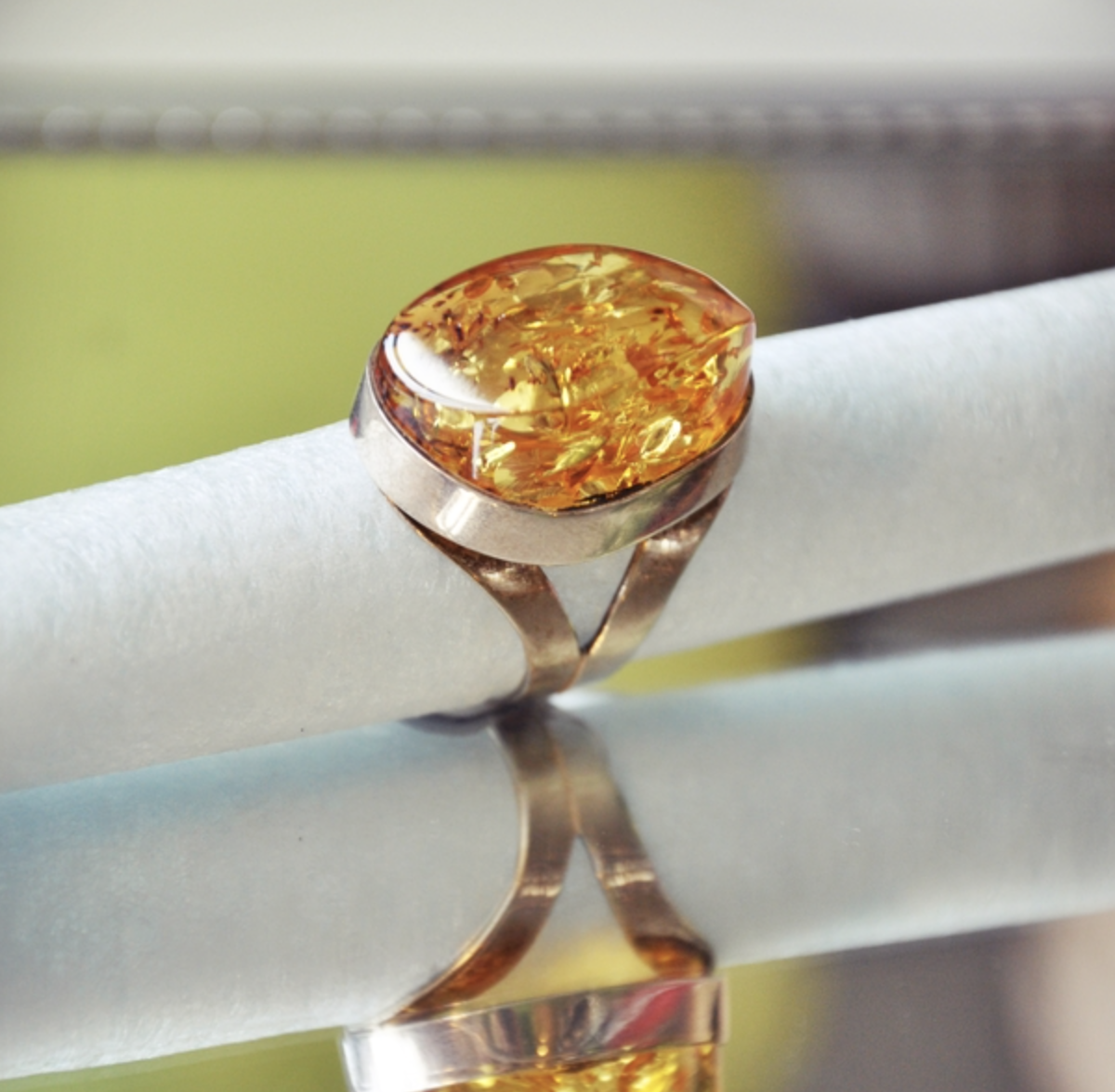 Przyciągający uwagę duży, efektowny klasyczny pierścionek z bursztynem bałtyckim. Kolor miodowy. Obrączka regulowana srebrna próby 925, rozmiar od 15 do 20.