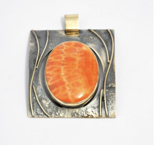 Prostokątna zawieszka w ciekawym łososiowym kolorze, oprawiona w srebro próby 925. Oczko zawieszki jest lekko wypukłe. Możliwość dokupienia do kompletu kolczyków oraz pierścionka.